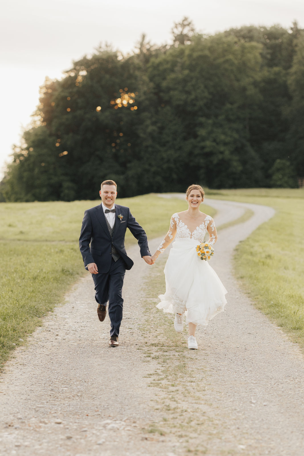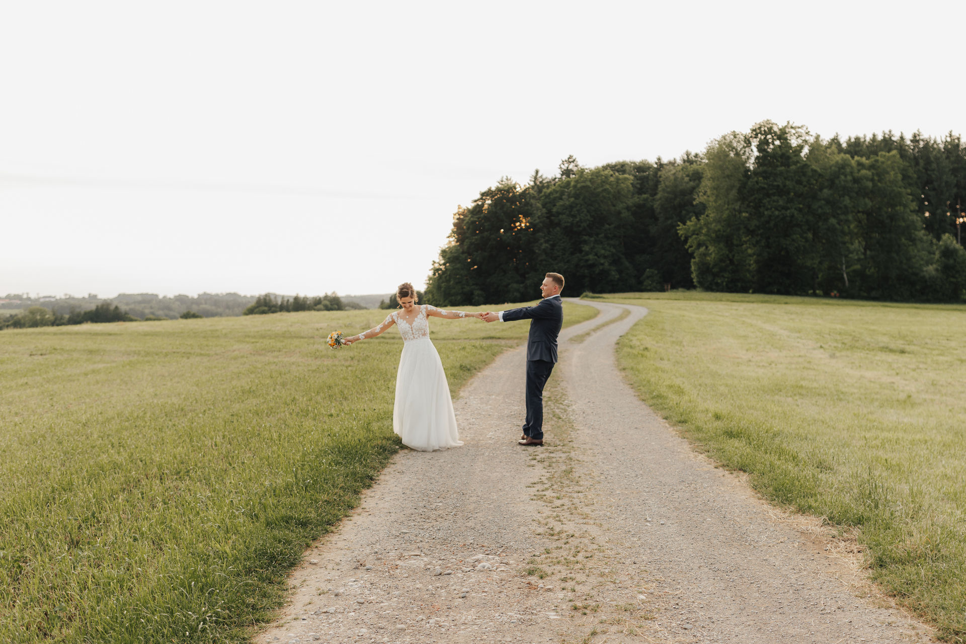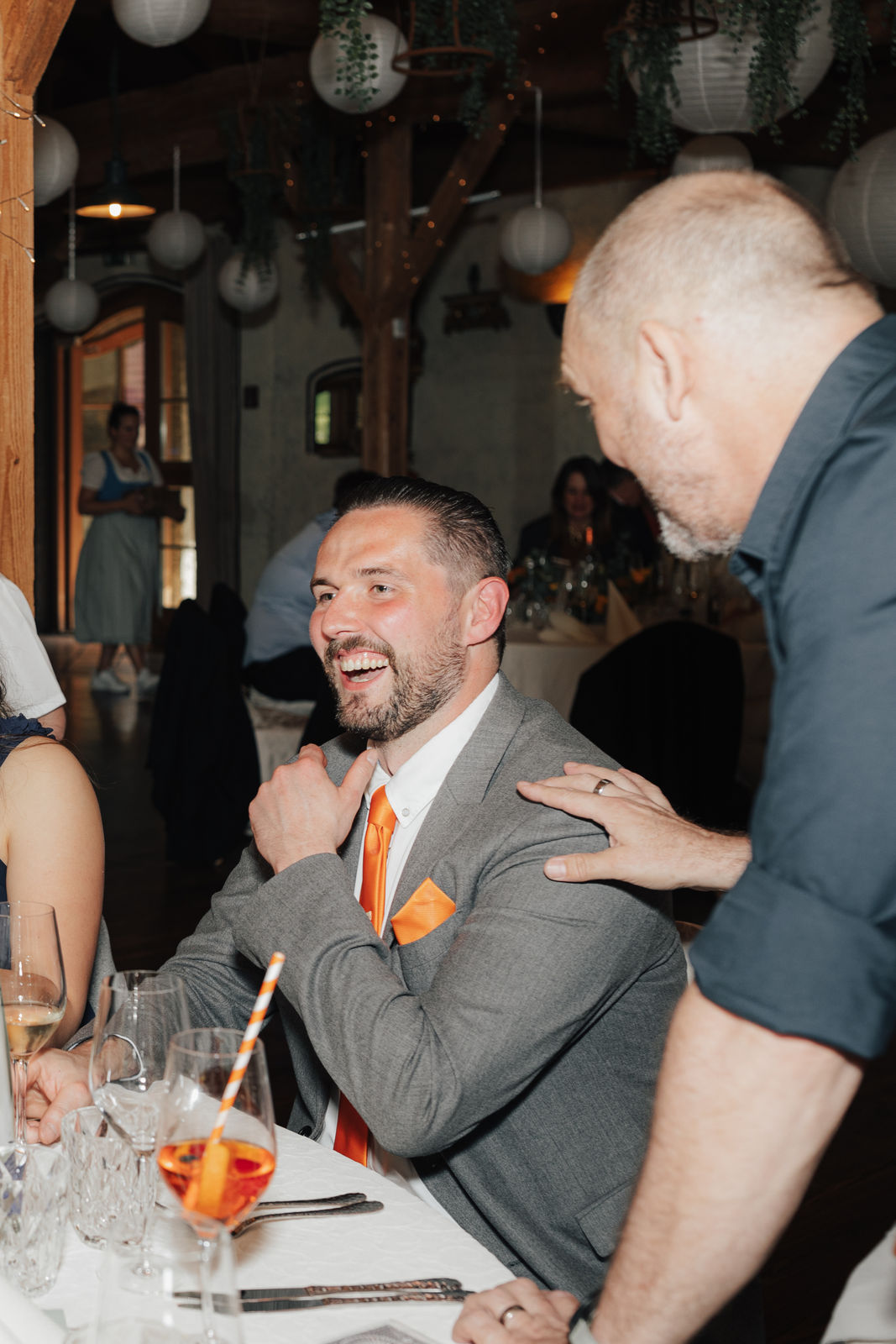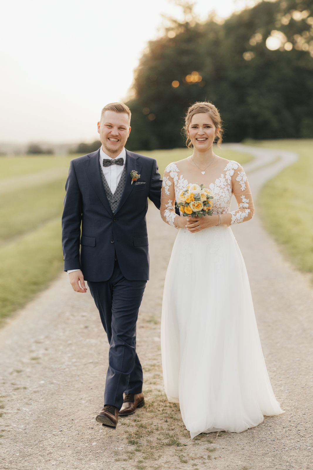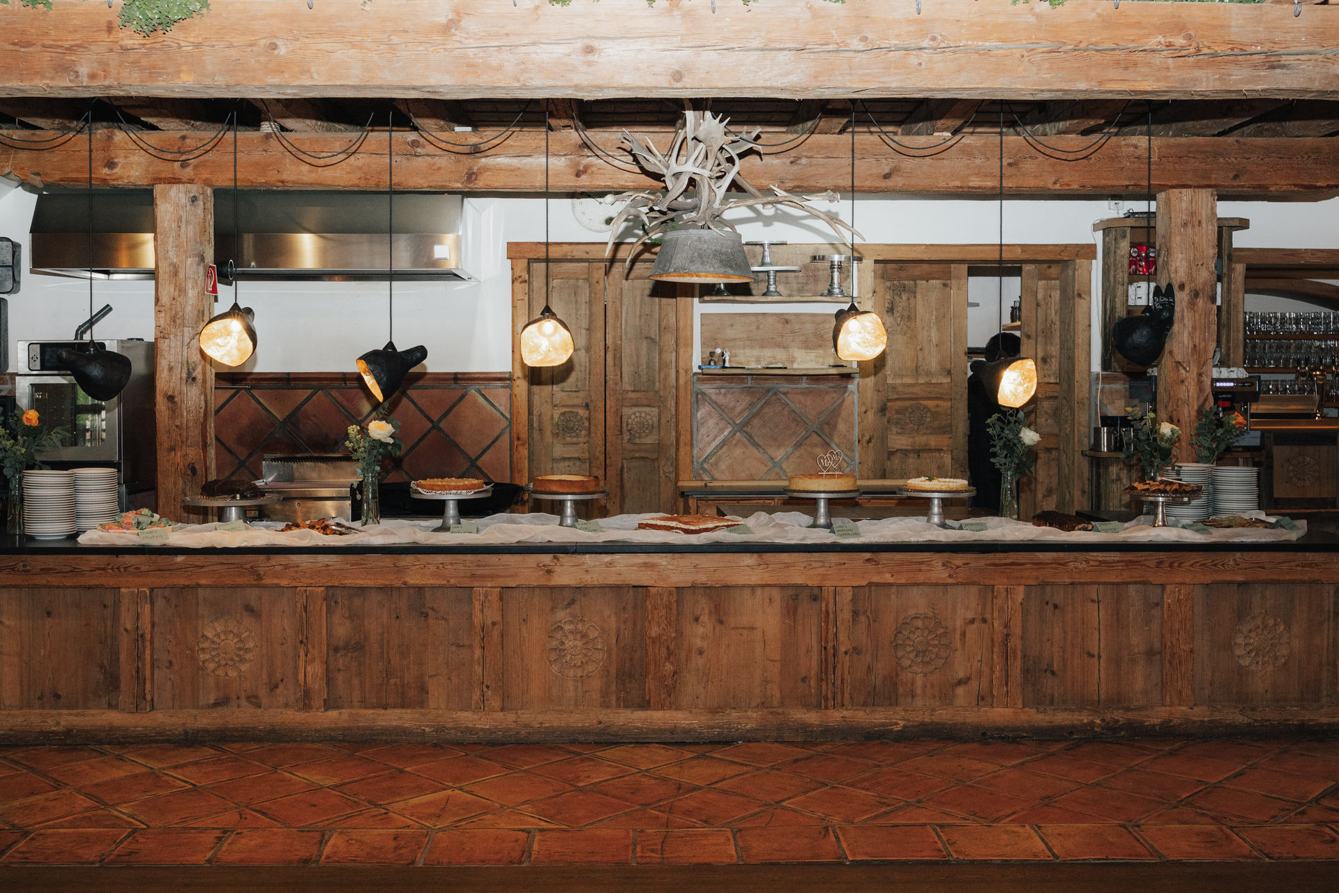 Angekommen an der Location, zog das Brautpaar durch ein Spalier von Gästen ein, gefolgt von Gratulationen und einem Sektempfang im Hof der Location. Nach einem Gruppenfoto ging es in den Saal, wo Kaffee und Kuchen serviert wurden – die Hochzeitstorte war der Lieblingskuchen der Braut aus der Café Lotte in Bad Aibling. Bereits am Nachmittag war die Feier in vollem Gange, die Hochzeitsgesellschaft und die Stimmung war einfach großartig. Zum Sonnenuntergang gab es ein Shooting, zuerst an der Location mit ihren tollen Fotospots und anschließend in der Natur.