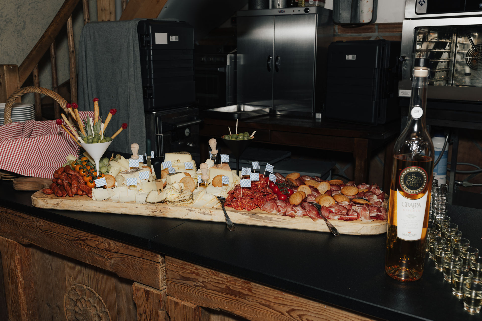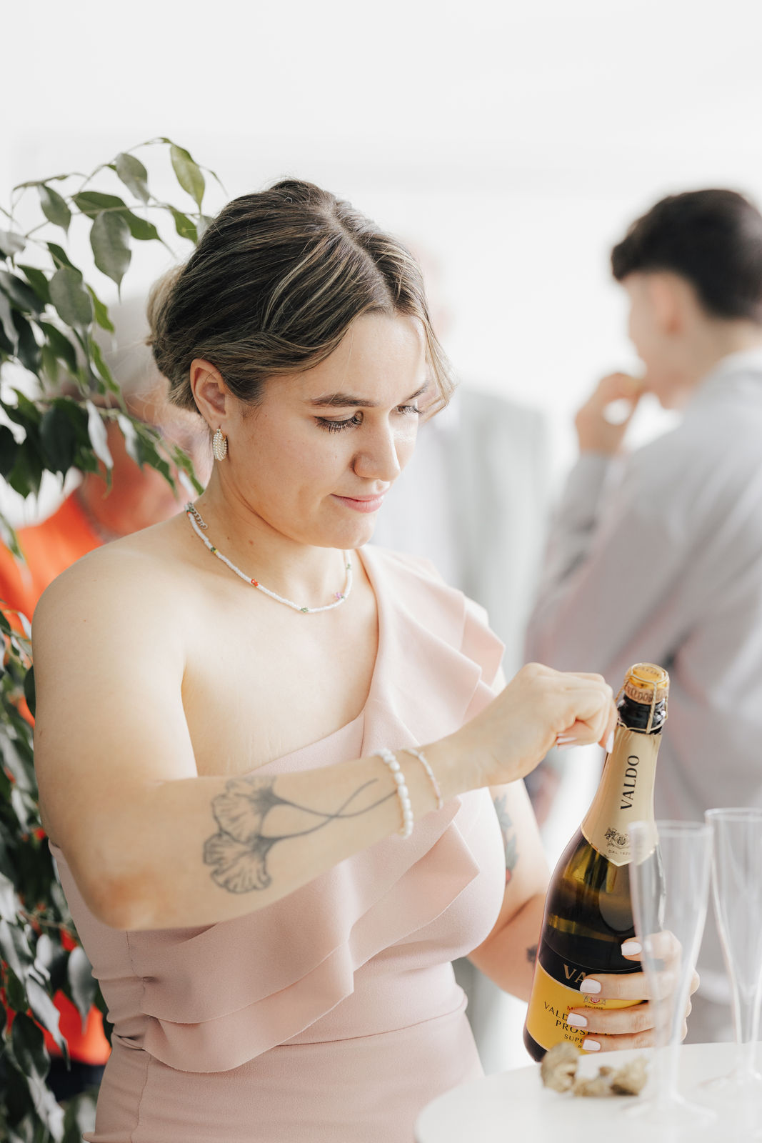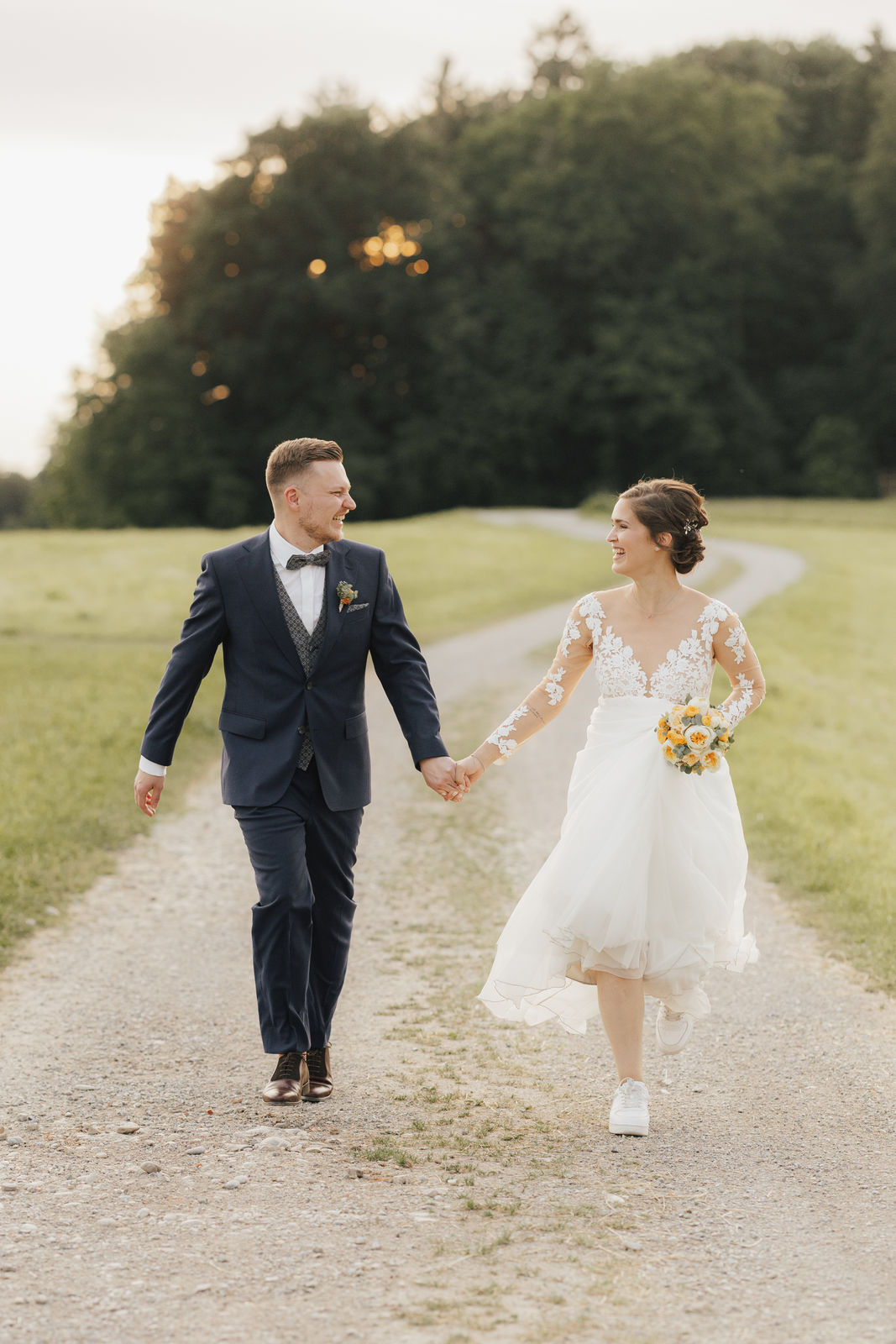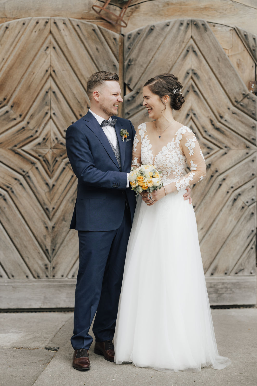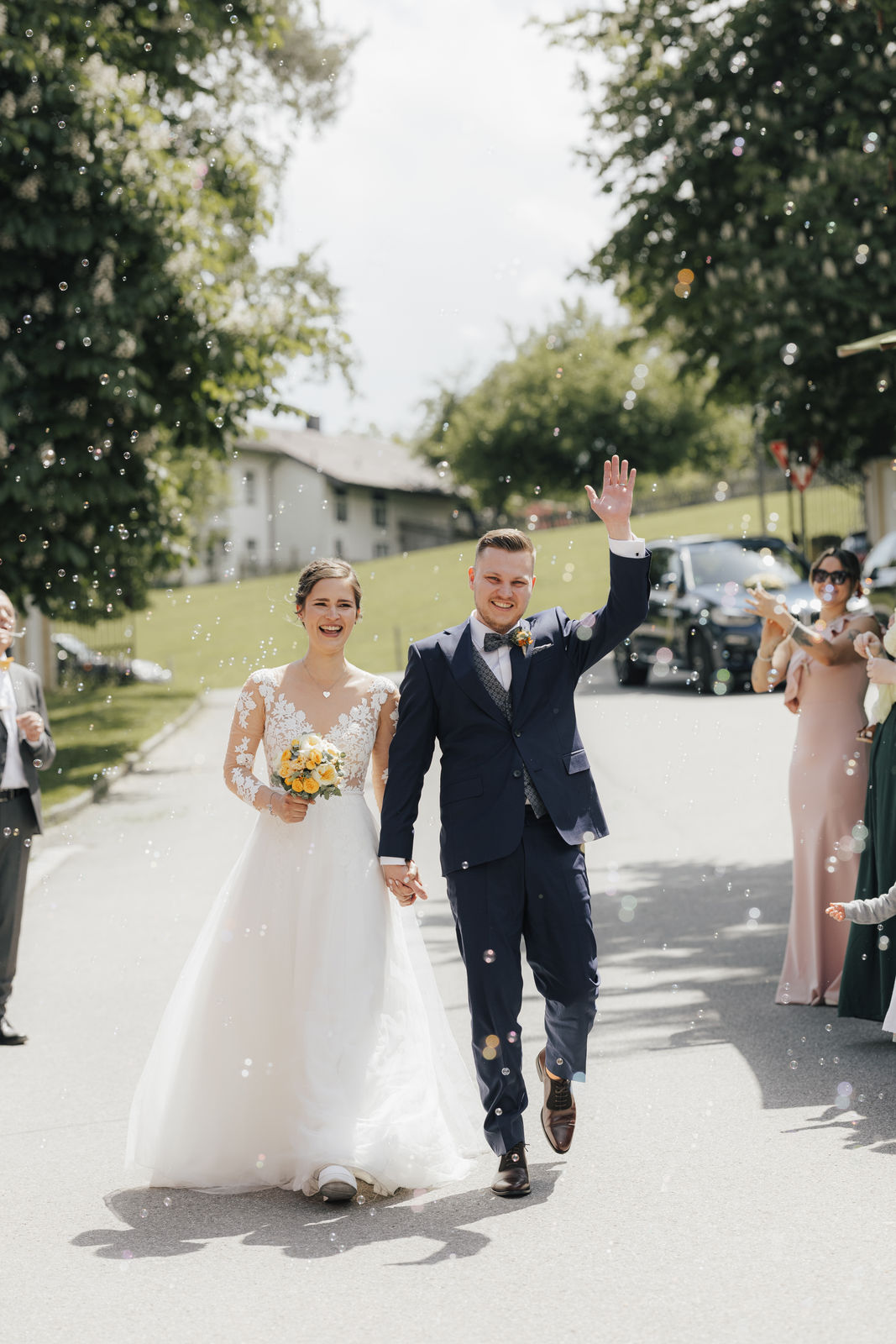 Angekommen an der Location, zog das Brautpaar durch ein Spalier von Gästen ein, gefolgt von Gratulationen und einem Sektempfang im Hof der Location. Nach einem Gruppenfoto ging es in den Saal, wo Kaffee und Kuchen serviert wurden – die Hochzeitstorte war der Lieblingskuchen der Braut aus der Café Lotte in Bad Aibling. Bereits am Nachmittag war die Feier in vollem Gange, die Hochzeitsgesellschaft und die Stimmung war einfach großartig. Zum Sonnenuntergang gab es ein Shooting, zuerst an der Location mit ihren tollen Fotospots und anschließend in der Natur.